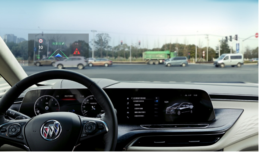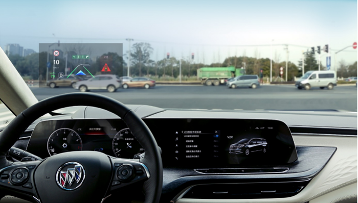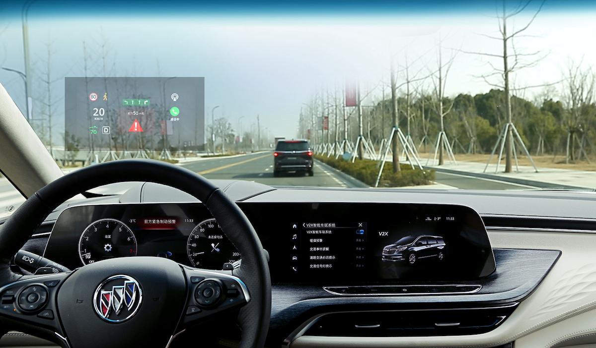 举例来说,车辆失控预警CLW是当别克GL8艾维亚感知到周围同样装载V2X技术的车辆触发ABS、ESP等被动安全系统,或双闪灯出现时,会在抬头显示HUD界面和仪表盘上方对驾驶者进行文字与图形预警,减少事故可能性。