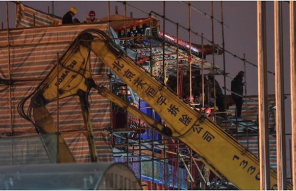 27日晚,国家开发银行总部大楼大门前的牌坊被围挡围住,工人们正在连夜进行拆除。