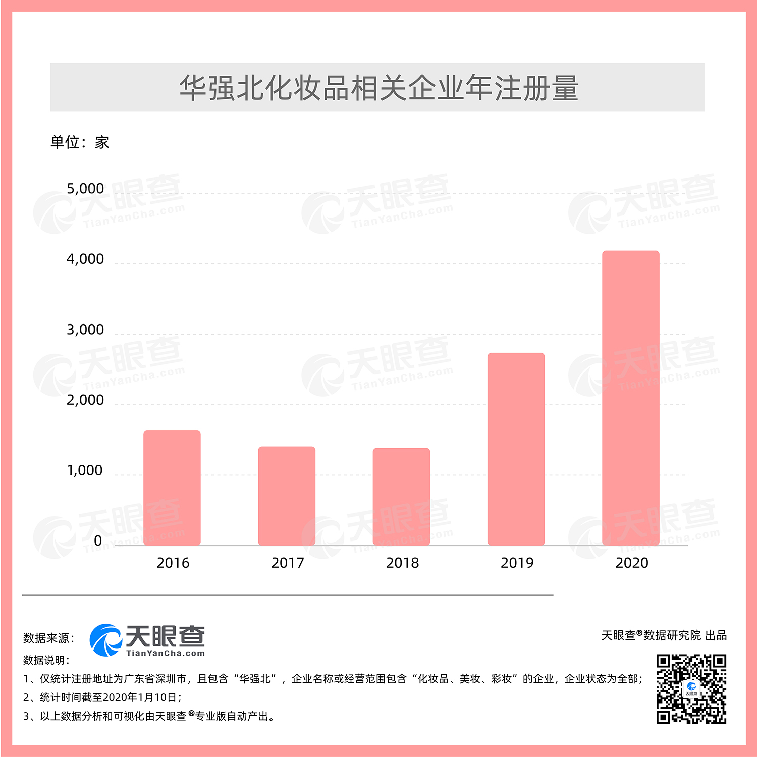 天眼查专业版数据显示,2017年-2020年间,华强北化妆品相关企业的注册量从1,634家增加至4,187家(全部企业状态),三年累计增幅156%。值得注意的是,2020年,华强北化妆品企业注册数较2019年增加了52%。