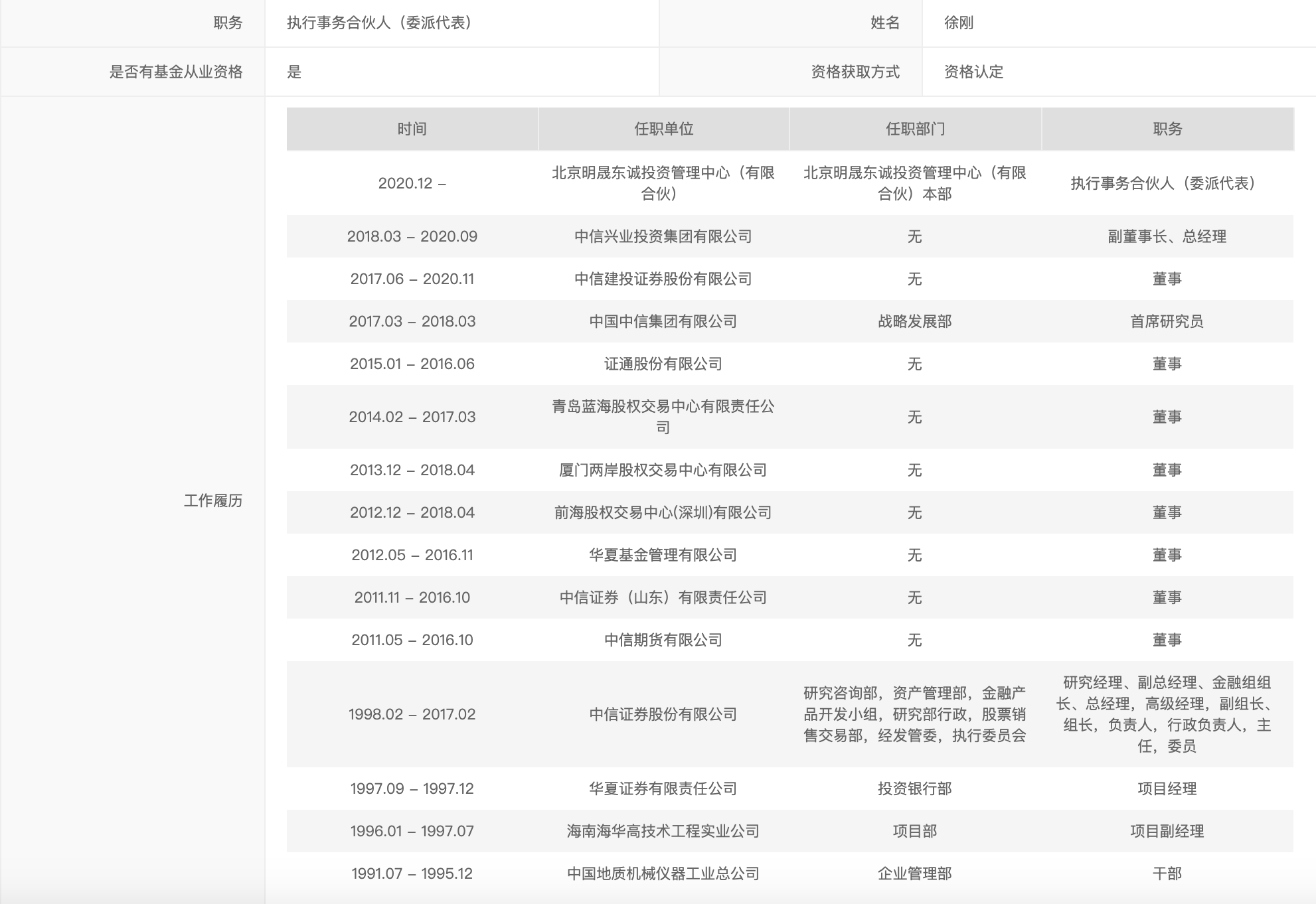 入股徐刚新设基金的私募大佬们大多拥有光鲜履历。
