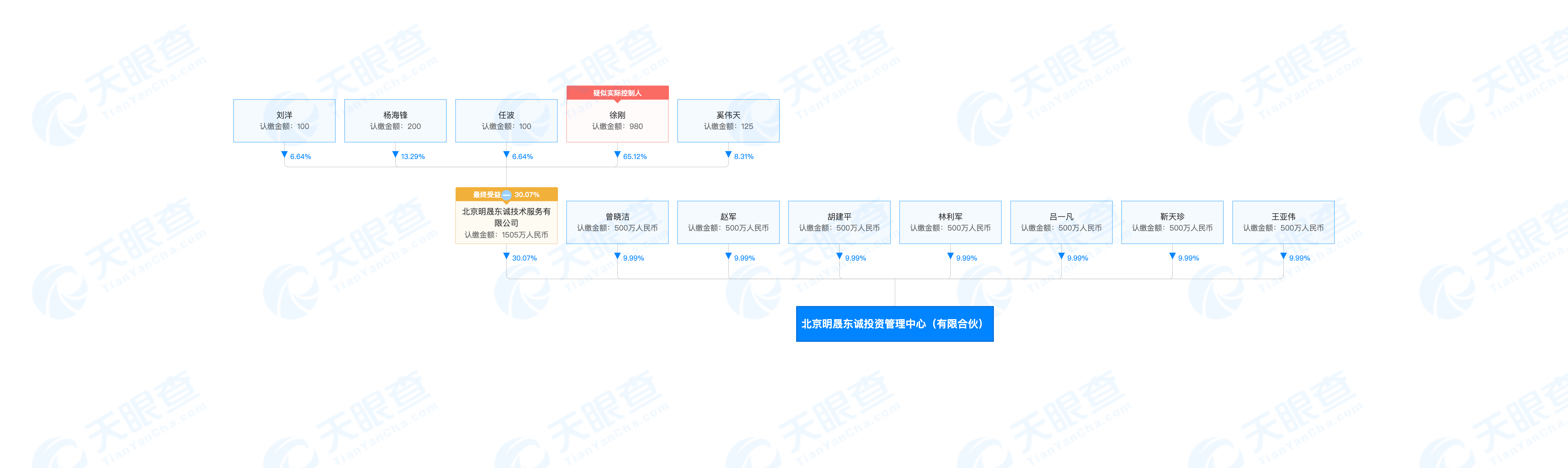 1月11日,北京明晟东诚投资管理中心(有限合伙)在中国证券投资基金业协会登记。其实控人和执行事务合伙人为中信证券履职多年的徐刚。股东阵营则更受关注,正心谷资本林利军、淡水泉投资赵军、千合资本王亚伟、煜德投资靳天珍、拾贝投资胡建平、源乐晟资产曾晓洁、睿泉毅信投资吕一凡均投资500万元,持股9.99%。