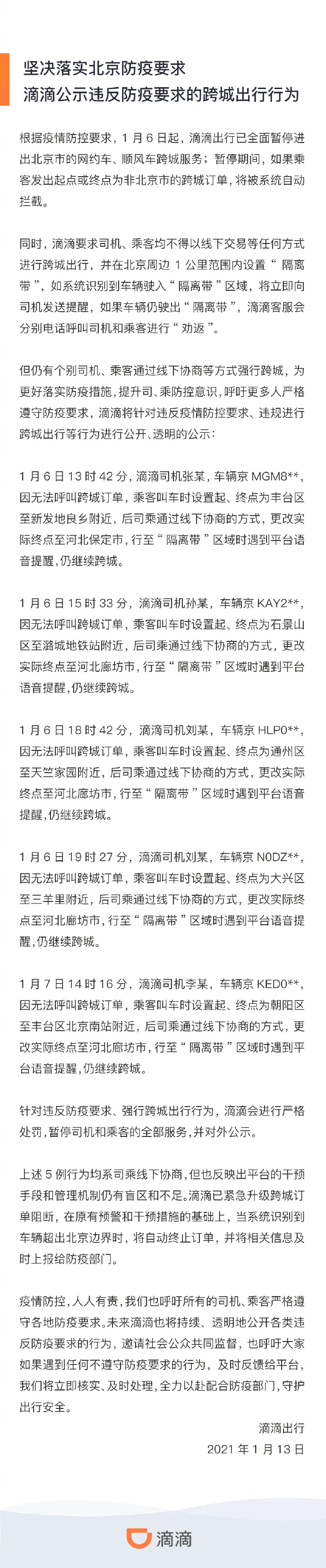 1月14日早间消息,滴滴出行于1月13日晚在其官方微博公示违反防疫要求的跨城出行行为:“5例行为均系司乘线下协商,但也反映出平台的干预手段和管理机制仍有盲区和不足。”