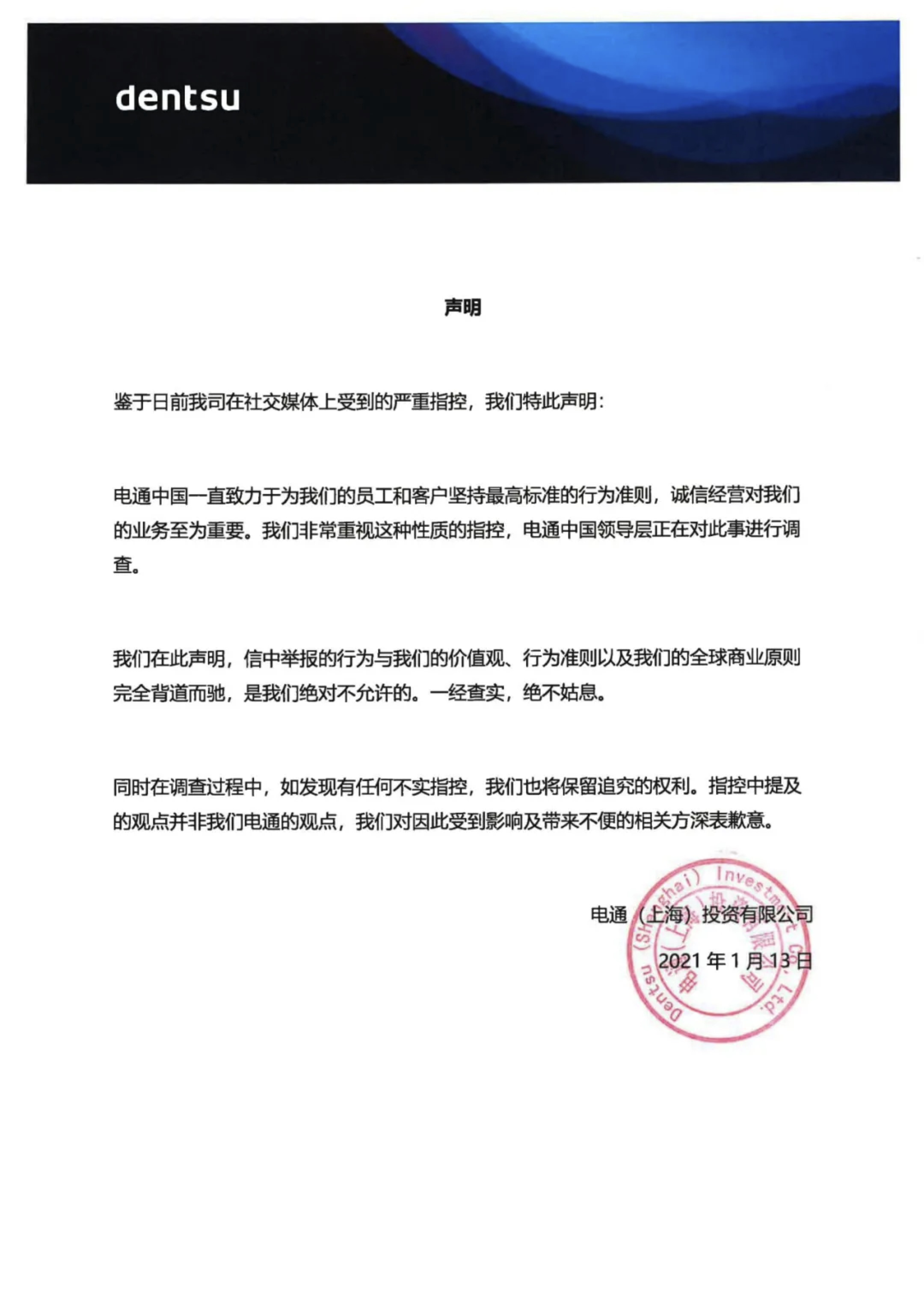 据“电通dentsu”微信公众号消息,电通中国于1月13日发布声明称:鉴于日前我司在社交媒体上受到的严重指控,我们特此声明,我们非常重视这种性质的指控,电通中国领导层正在对此事进行调查,“一经查实,绝不姑息”。