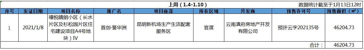 上周(1月4日-10日), 2021年的第一周,昆明楼市显得较为冷清,既无项目开盘,预售证发放数量也差点挂零,只有过规方面较为热闹。具体来说,上周仅1项目获得预售证,新增预售面积环比减少约91%;过规方面,有5个项目获批,其中,官渡区有一所国际双语学校落地。