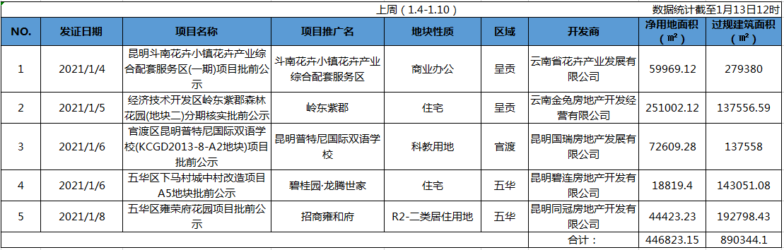 据昆明市自然资源和规划局信息显示,上周昆明本地有5个项目通过建设规划许可审批。过规总建面约89万方,净用地面积约45万方。与前一周过规总建面96万方,净用地面积21万方相比,过规总建面环比下跌约7%,净用地面积则环比增长约1倍。