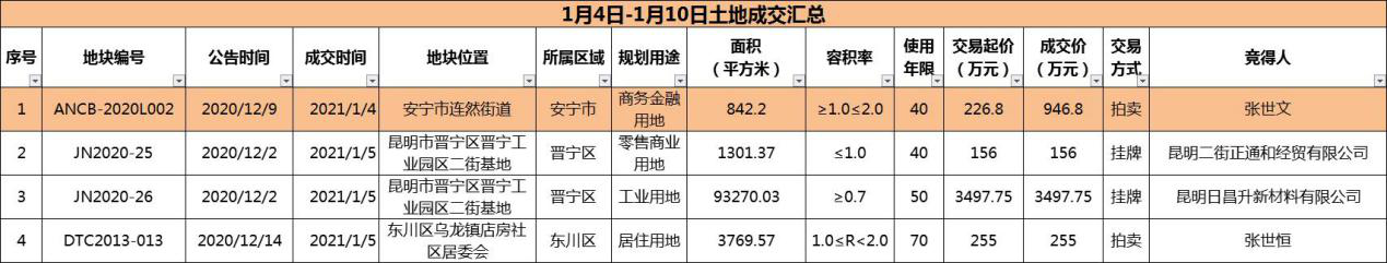 与前一周相比,上周昆明主城区无土地成交,市场热度明显降低。安宁市、东川区及晋宁区三地共有4宗土地挂牌到期,且均成功交易,总成交面积约148.8亩,成交金额约4855.6万元。
