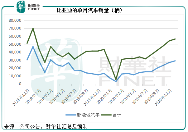2020年上半年,比亚迪纯电动乘用车销量同比下滑51.7%,至4.63万辆,而到2020年第3季,在“汉”的带动下,纯电动车销量同比增长15.1%,至3.21万辆;到第四季,纯电动车销量更同比大增1.24倍,至5.26万辆。