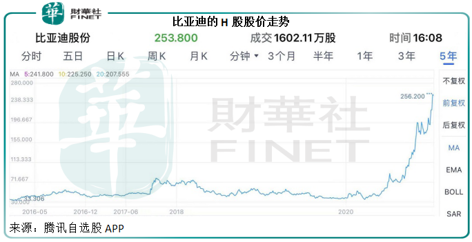 从下图可见,比亚迪的H股股价从2020年5月开始起飞,由低位42.334港元飙至2021年1月11日时的纪录高位264.6港元,涨幅高达5.25倍。