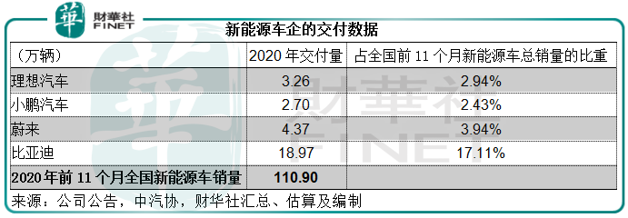 从比亚迪的刀片电池产能布局来看,重庆、长沙、贵阳、蚌埠等基地或会在2021年及以后投产,这意味着比亚迪的新能源车产能扩张也在进行中。而比亚迪2020年的新能源车交付量达到了18.97万辆,几乎是蔚来、理想和小鹏三家交付量合计的两倍。