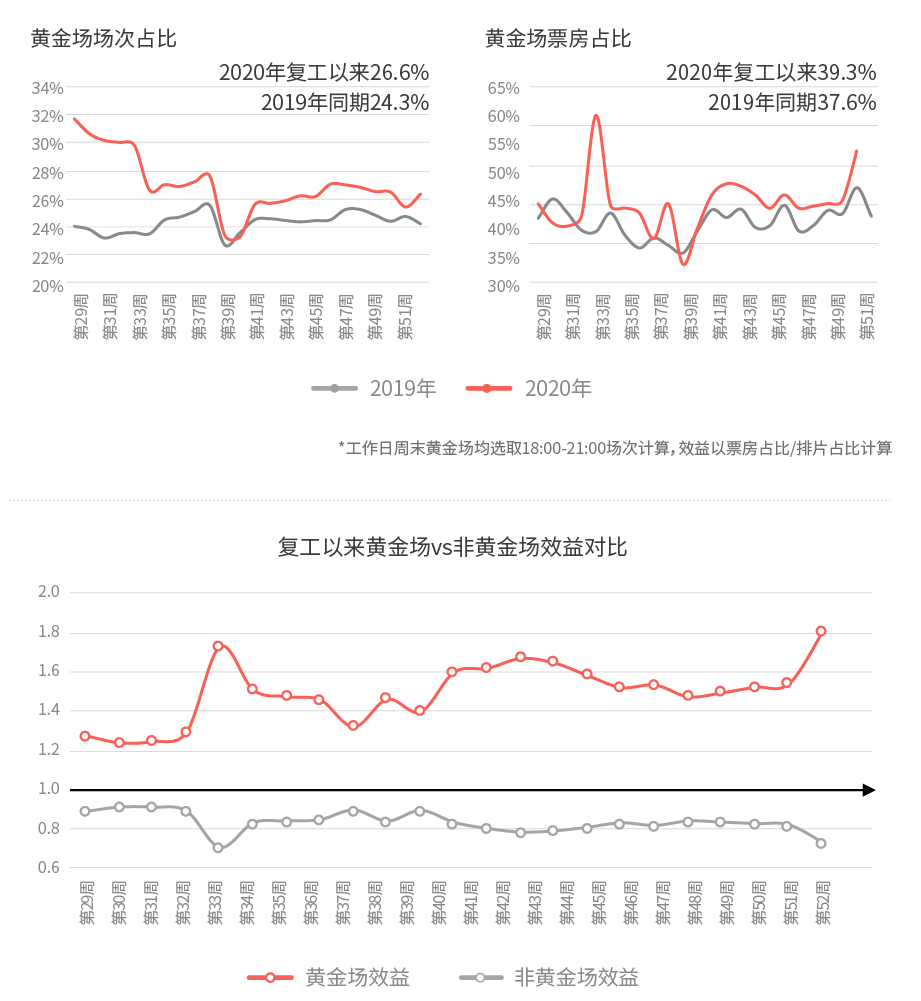 其次是2020年后疫情时代影院放映场次的调整。根据猫眼研究院的调查发现,自复工以来,影院为了降低经营成本,减少了工作日以及非黄金场的放映场次,而观众们也作出了倾向于周末和黄金场观影的选择,从而持续扩大了两者之间的收益差。