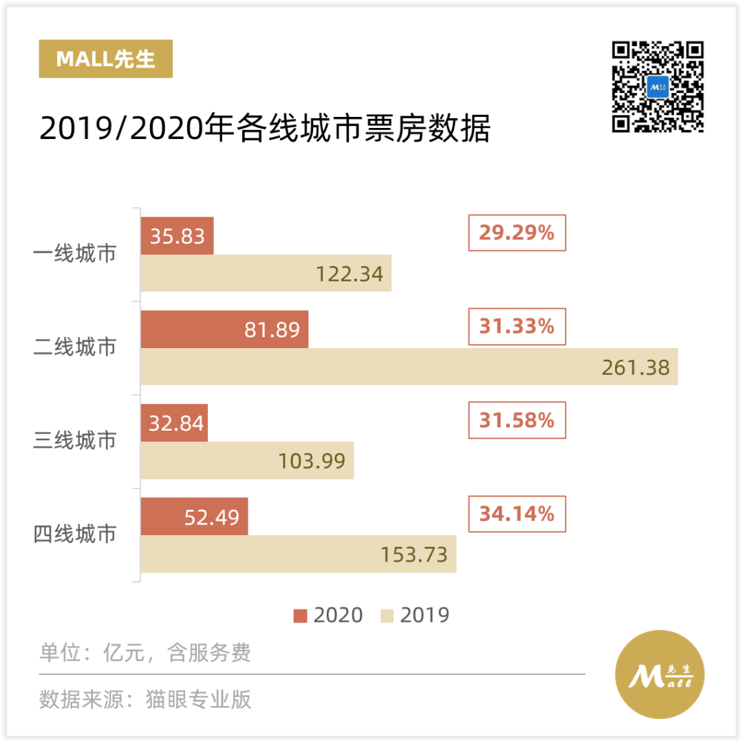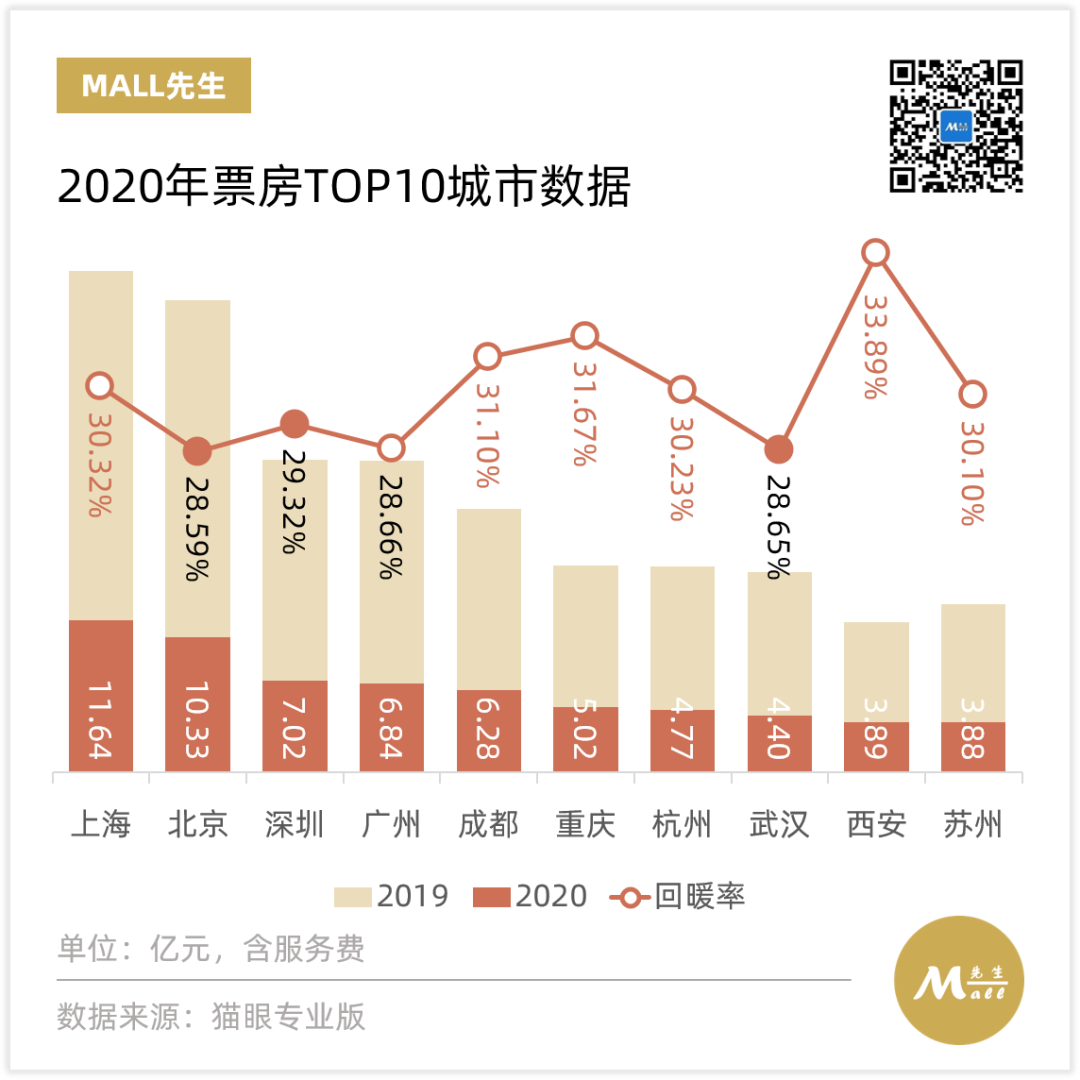 在2019年全国电影票房排名前10的城市中,回暖率不足30%的城市为:北京、深圳、广州和武汉。而西安则以33.89%的回暖率跃居第9,挤掉南京跻身2020年全国票房前10。