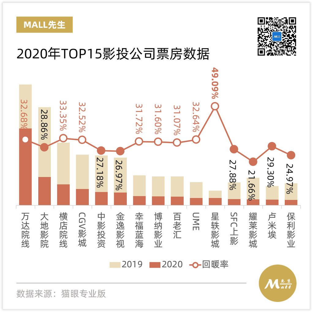 影投公司方面,与2019年相比,全国前6的排名不变,充分证明了“你大爷还是你大爷”。第7、第8的博纳与幸福蓝海的排名互换,UME则取代多家影院迟迟不能复工的耀莱进入全国前10。