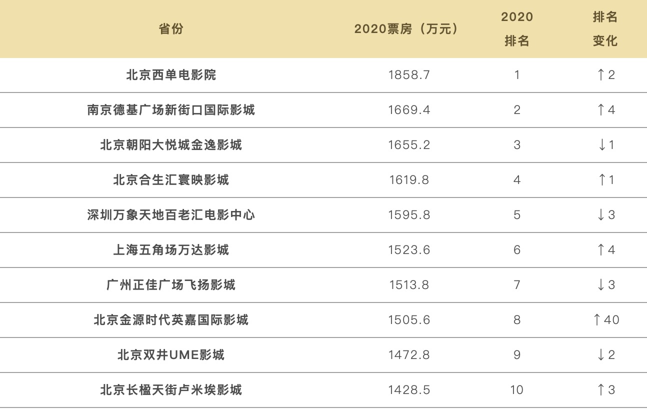 具体到各家影城,前10的阵容出现了些许变动,头把交椅让给了2019年排名第3的北京首都西单电影院。北京金源时代的英嘉国际影城和北京长楹天街的卢米埃则取代疫情后始终未开张的卫冕冠军北京耀莱成龙影城(五棵松店)、北京金泉港IMAX国际影城,进入全国前10强行列,但第10名的票房已不足1,500万元。