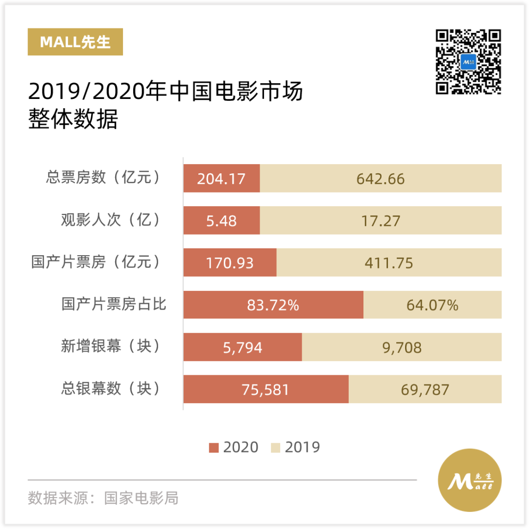全年新增银幕5,794块,推动全国银幕总数达到7,5581块。但同样值得关注的是疫情下大量影院处于淘汰边缘,有数据称,受疫情影响,去年自二季度起至年底均无票房收入的影院超过800家,合计银幕数超过4,000张。这其中包括了始终未复工的多年全国票房冠军:北京耀莱成龙影城(五棵松店)。
