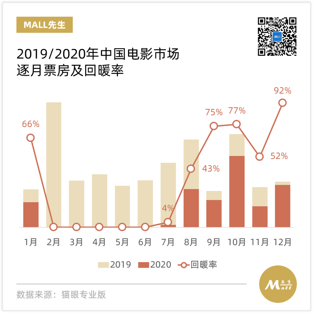 从恢复情况来看,自7月影院解禁后,整体电影市场持续回暖,并在年末达到高峰,12月全月票房已超过2019年同期水平的90%。
