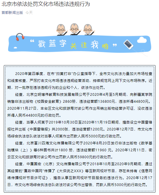 1月14日,首都新闻出版微信公众号通报,2020年第四季度,在市“扫黄打非”办公室指导下,全市文化执法力量加大市场检查和线索核查,严厉打击文化市场违法违规经营活动,持续规范网上网下文化市场秩序。近期,对一批存在违法违规行为的企业和个人,依法作出处罚。
