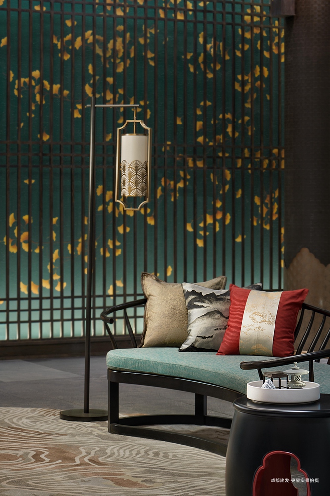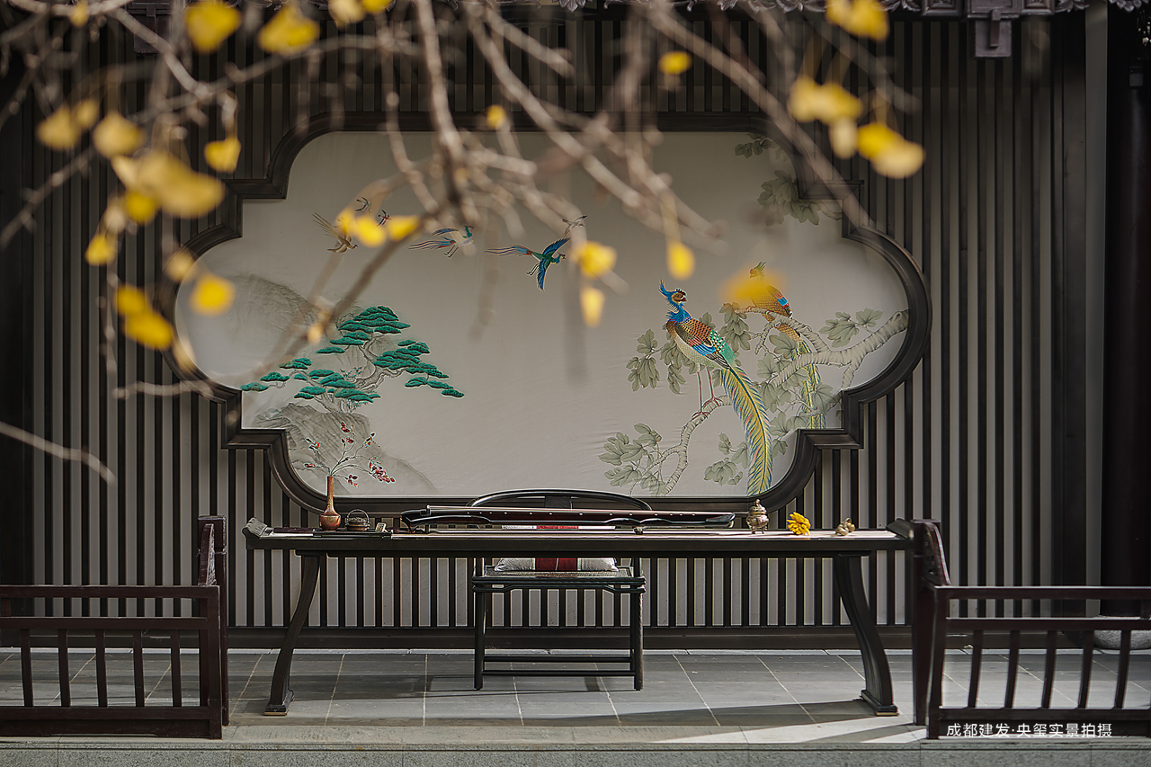 银杏院落设计为四水归堂,“流金洒银”寓意储蓄财富。“七弦生百韵,一曲动千秋。”院落中间的琴台诉说着文君与相如的爱情故事。琴台背后,3位美术大师用时3个月,以传统蜀绣技法绘制、裱装了一幅百鸟朝凤图。