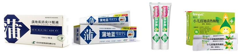 先上一张图看看,从左到右分别是蒲地蓝消炎口服液、蒲地蓝牙膏(成人)、蒲地蓝儿童牙膏、小儿豉翘清热颗粒,
