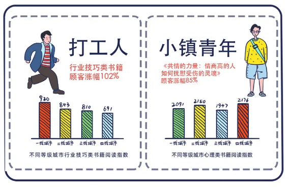 面对压力,一些职场人则是通过阅读开始了自我学习之路。报告显示,一线城市的“打工人”偏好“人在职场”相关图书,而“小镇青年”则买了更多心理类图书。其中,行业技巧类书籍顾客涨幅120%,不同等级城市行业技巧类书籍阅读指数也不同,一线城市阅读指数最高。