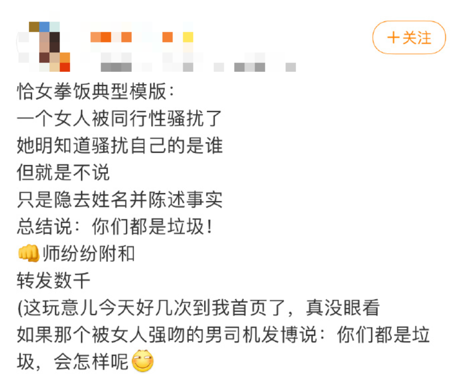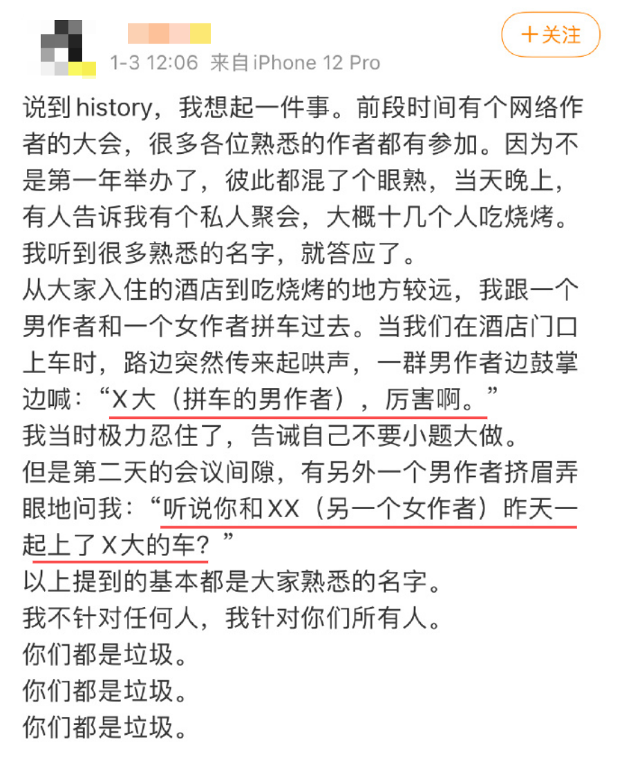 所以,整件事总结一下,就是一个遭遇了言语性骚扰的女作者吐槽了一个群体现象,却被各方势力围剿,没有收到任何道歉不说,自己还被泼了一身脏水,事业也因此受到影响。