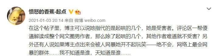 之后,《赘婿》的原作者@愤怒的香蕉 也加入了争论,他表示虽然理解女作者是受害者,但认为点出那些起哄的人并不会被网暴,不愿意公布才是在“保护垃圾”,更会连累其他男作者。