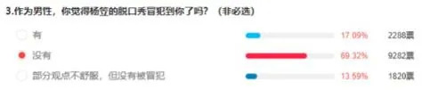 就拿杨笠这件事来说,凤凰网娱乐曾在去年12月28日发起了有关“你如何看待脱口秀演员杨笠遭举报?”的调查,有六万多人参与。结果显示,七成男性用户表示没有被冒犯。