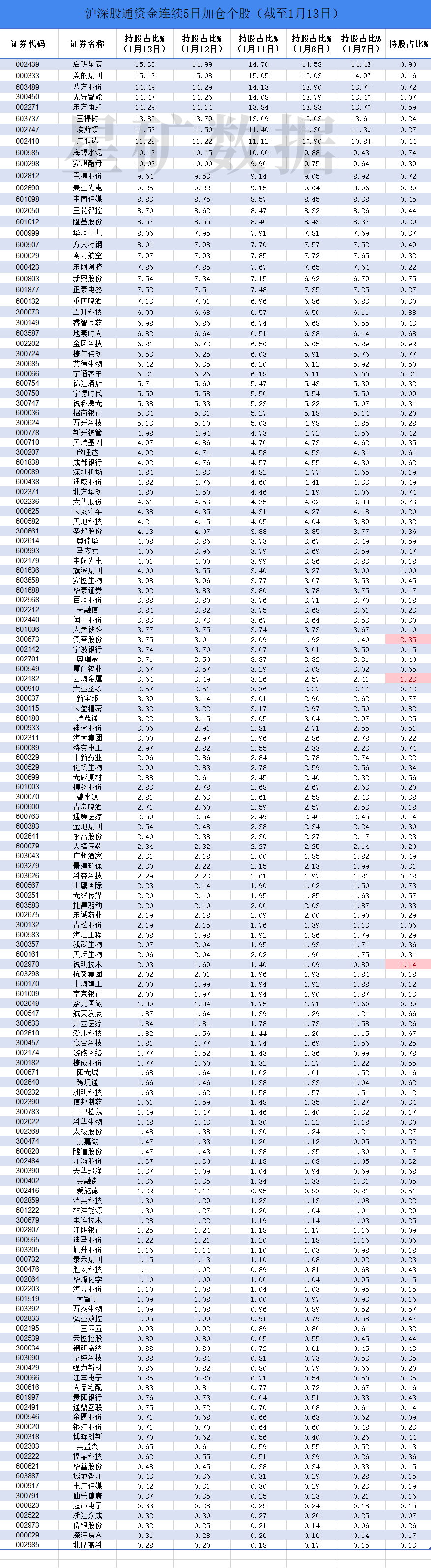 截止1月13日数据显示,148只个股连续5日获沪深股通加仓,其中云海金属(+1.23%)、佩蒂股份(+2.35%)、锐明技术(+1.14%)等3只增幅居前;从行业看,计算机应用(5.4%)、专用设备(6.1%)占比较多。