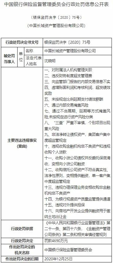 对长城资产公司的处罚信息公开表(银保监罚决字(2020)75号)显示,银保监会在现场检查时发现了16项违法行为,被罚了4690万元。