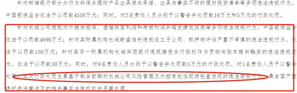 银保监会在文章中指出:“本次行政处罚主要基于我会前期对长城公司风险管理及内控有效性现场检查发现的违法违规行为。”