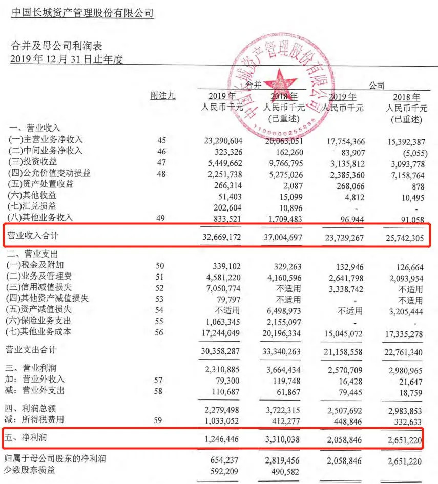 2019年度长城资产合并报表的营业收入为326.69亿元,2018年是370.05亿元。同期净利润方面下滑相对较多,2018年是33.1亿元,2019年只有12.46亿元。