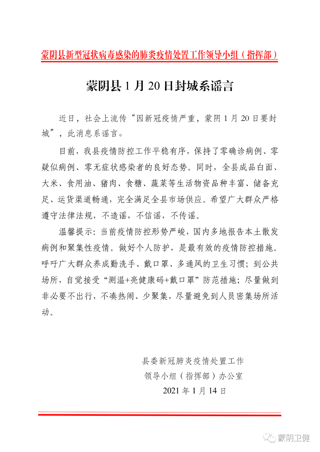 据山东“蒙阴卫健”微信公众号消息,近日,社会上流传“因新冠疫情严重,蒙阴1月20日要封城”,此消息系谣言。目前,蒙阴县疫情防控工作平稳有序,保持了零确诊病例、零疑似病例、零无症状感染者的良好态势。同时,全县成品白面、大米、食用油、猪肉、食糖、蔬菜等生活物资品种丰富、储备充足、运货渠道畅通,完全满足全县市场供应。希望广大群众严格遵守法律法规,不造谣,不信谣,不传谣。