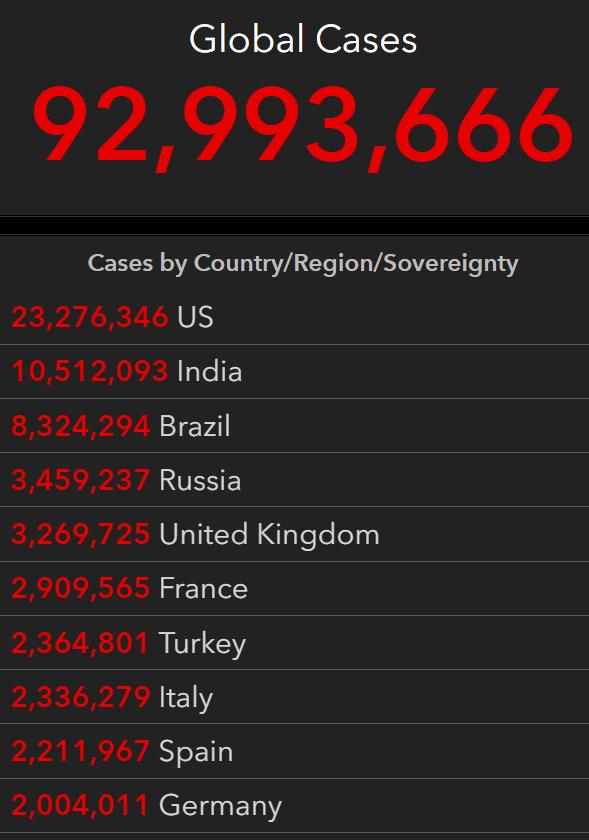 据约翰斯·霍普金斯大学的疫情追踪数据,截至北京时间1月15日8点,全球累计确诊新冠肺炎病例92993666例,累计死亡1991206例。