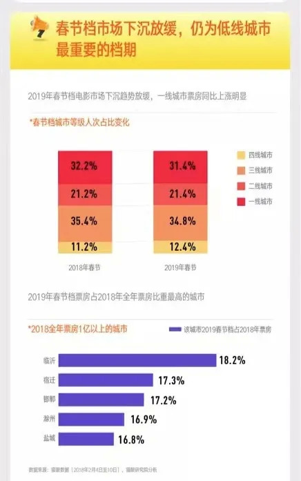 以2018年全年票房为参照,2019年春节档票房收入在临沂、宿迁、邯郸、滁州、盐城几个低线城市占2018年全年票房比重超过15%,可见春节档对低线城市的重要意义。