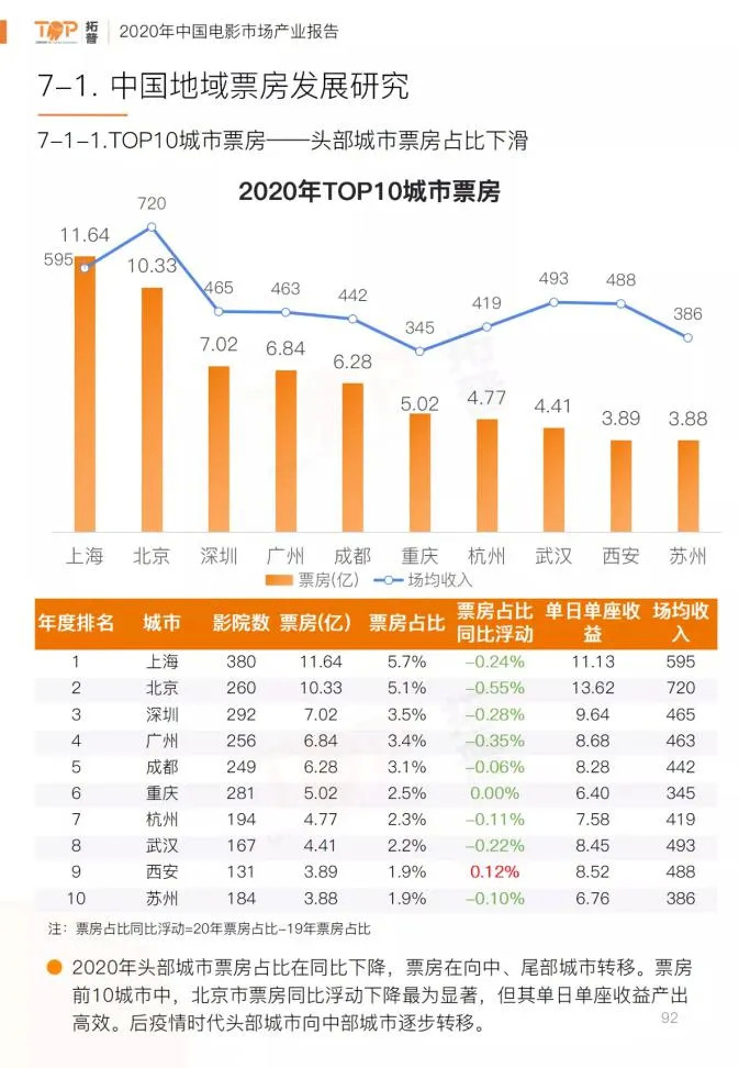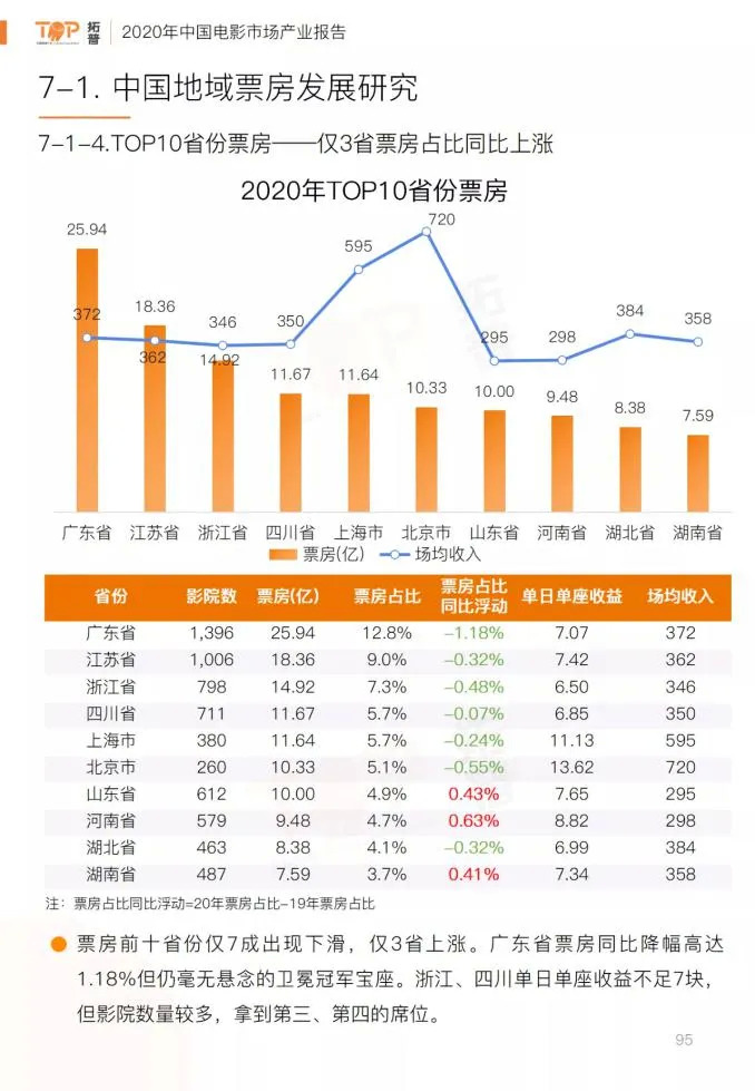根据拓普数据的《2020年中国电影市场产业报告》,2020年票房TOP10省份中南方城市占据7席。上榜的3个北方城市中,河南省暂未出现疫情,北京和山东疫情规模目前控制良好。