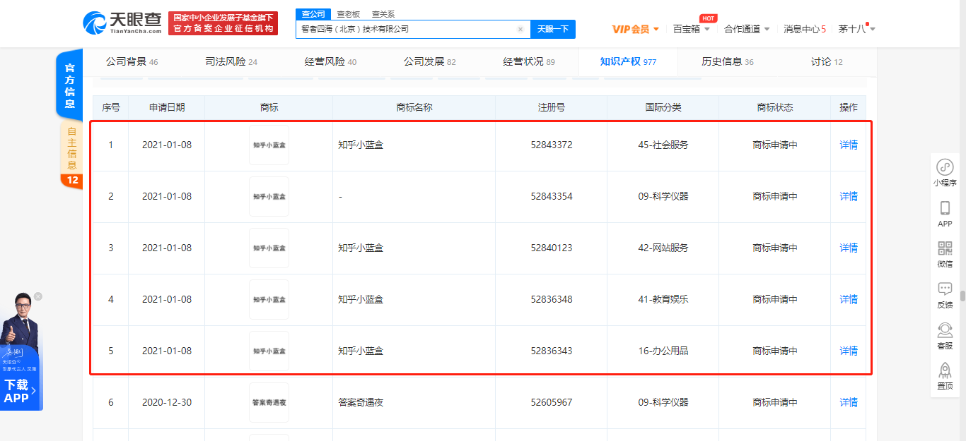 据天眼查APP显示,1月8日,知乎关联公司智者四海(北京)技术有限公司新增“知乎小蓝盒”的商标申请信息,申请日期为2021年1月8日,国际分类包括社会服务、科学仪器、网站服务等,商标状态为“商标申请中”。