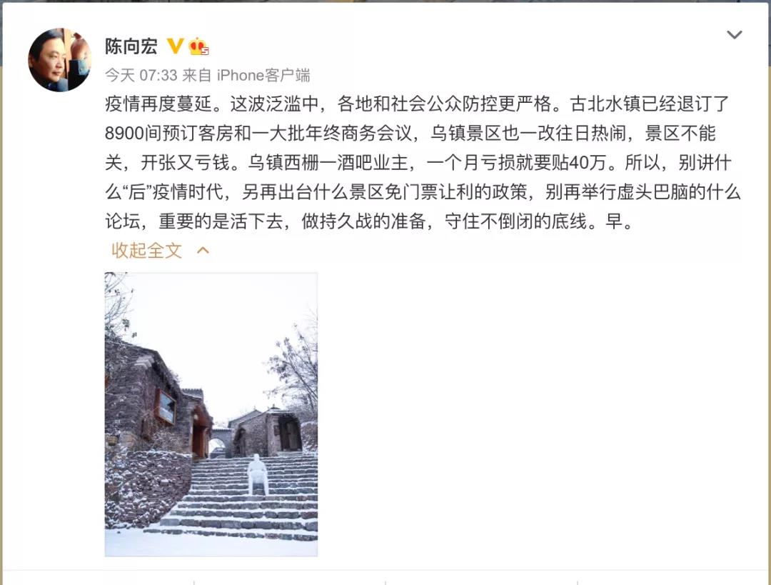 14日7点33分,陈向宏在个人微博表示,“疫情再度蔓延。这波泛滥中,各地和社会公众防控更严格。古北水镇已经退订了8900间预订客房和一大批年终商务会议,乌镇景区也一改往日热闹,景区不能关,开张又亏钱。乌镇西栅一酒吧业主,一个月亏损就要贴40万。”