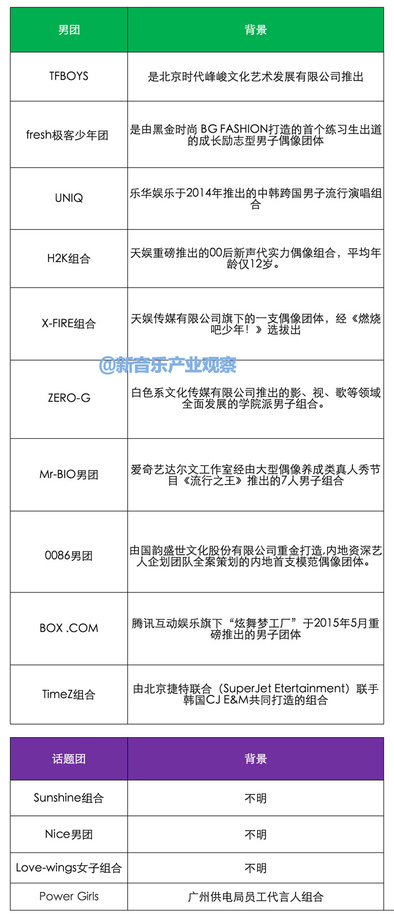 幕后公司的多样化:有天娱、乐华这样的知名娱乐公司,有酷狗、爱奇艺这样的互联网公司,更多的是一些不太知名的公司。包括TFBOYS,在他们走红之前,你听说过“时代俊峰”吗?