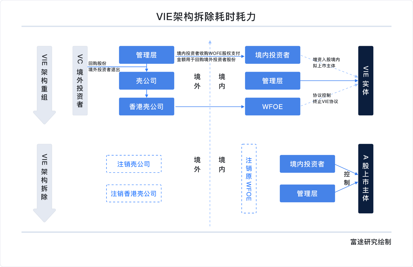 由于大部分中概股采用VIE架构海外上市,但选择回归时需要拆除,由于涉及多方利益,境内境外操作繁琐,耗时耗力。中概私有化借壳回归的时间成本比较高,监管风险也比较大。