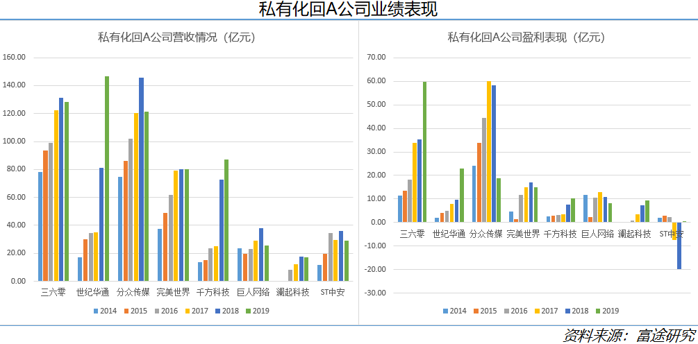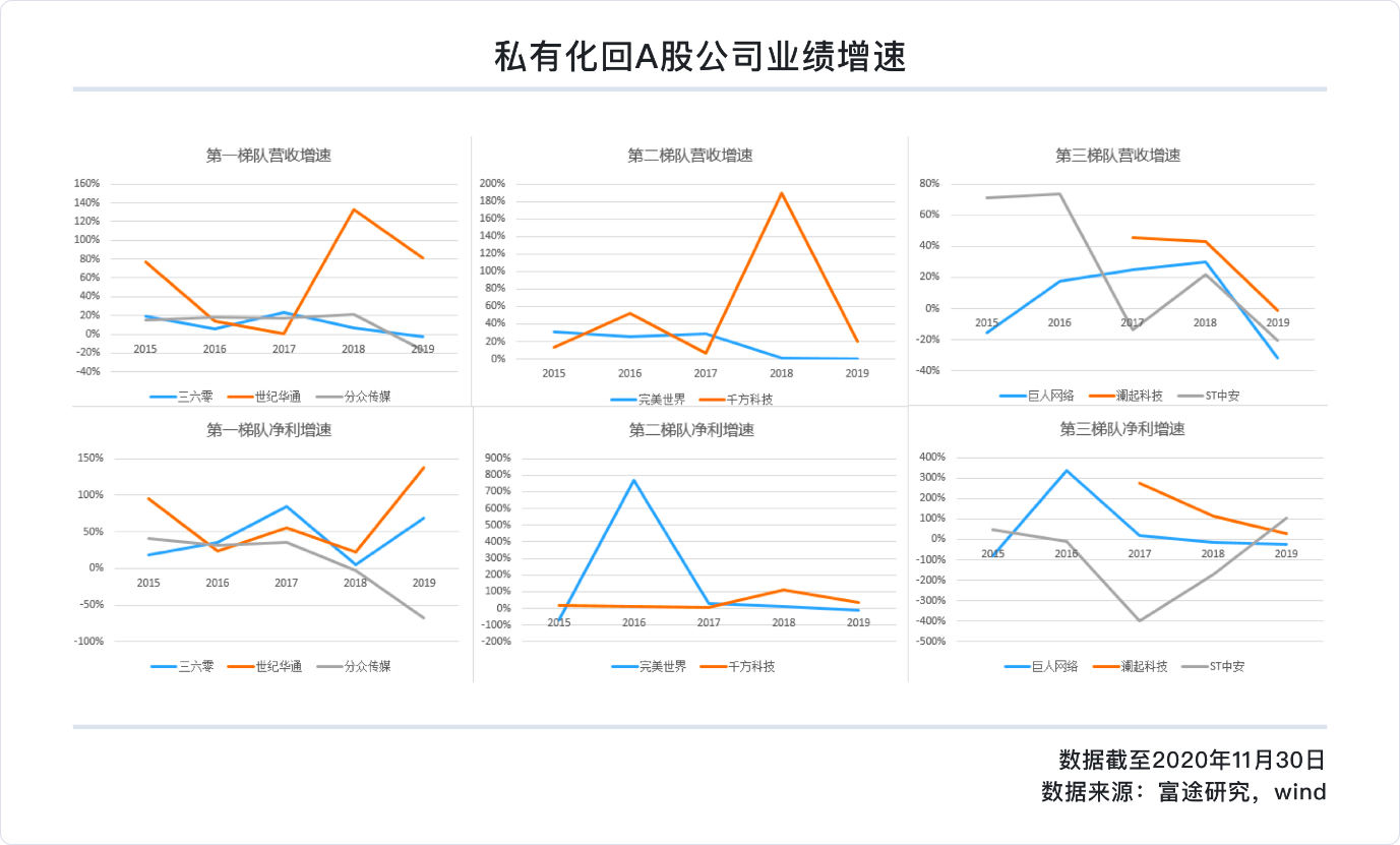 那批回归潮中的头部公司有360、分众传媒以及盛大网络,通过资产重组,世纪华通取得现在盛大游戏资产,这些企业在营收净利方面也处于第一梯队;第二梯队的游戏公司完美世界以及从事智能交通的千方科技;第三梯队则是史玉柱的巨人网络,还有澜起科技和中安消。