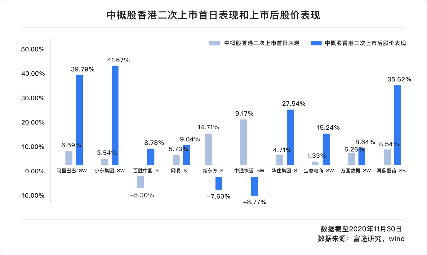 自2019年阿里巴巴掀起港股二次上市回归大潮后,2020年迎来高峰,年内有9家中概股回归港股,与此前私有化借壳回归不同,二次上市的推进流程便利,市场承接力也比较好,市场整体表现比较正面。