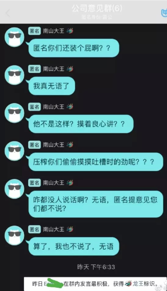 比如前一段时间,某位借着QQ匿名痛骂老板的打工人,因为骚话过多,成功被系统授予“龙王”标识(奖励给前一天发言最多的人),真实ID也随之泄露,当场完成自爆。