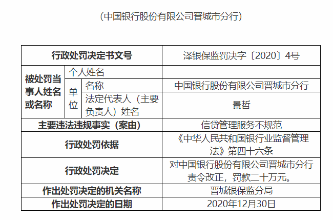 1月15日消息,据晋城银保监分局行政处罚信息公开表,中国银行股份有限公司晋城市分行存在信贷管理服务不规范的违法违规行为,晋城银保监分局对中国银行股份有限公司晋城市分行责令改正,并罚款二十万元。
