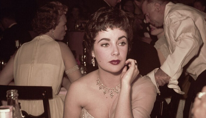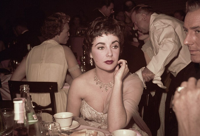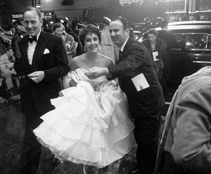另一张照片则展示了在1953年,伊丽莎白·泰勒身穿白色印花抹胸长裙,赶往雷电华潘太及斯剧院的场面。那一年也是奥斯卡第一次通过电视进行转播。
