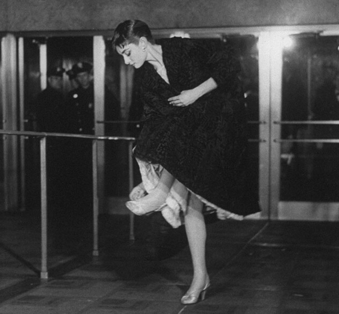 如今的红毯走秀中,演员们都竭尽所能让自己看上去完美无瑕,并且在镜头前摆着各种各样的姿势。不过这张拍摄于1955年的照片展示奥黛丽·赫本在赶往举行颁奖典礼的NBC世纪剧院的路上时,停下来调整自己的高跟鞋的场面。她在那一届奥斯卡中没有获奖,不过凭借着自己在《龙凤配》中的演出得到了最佳女演员奖项的提名。