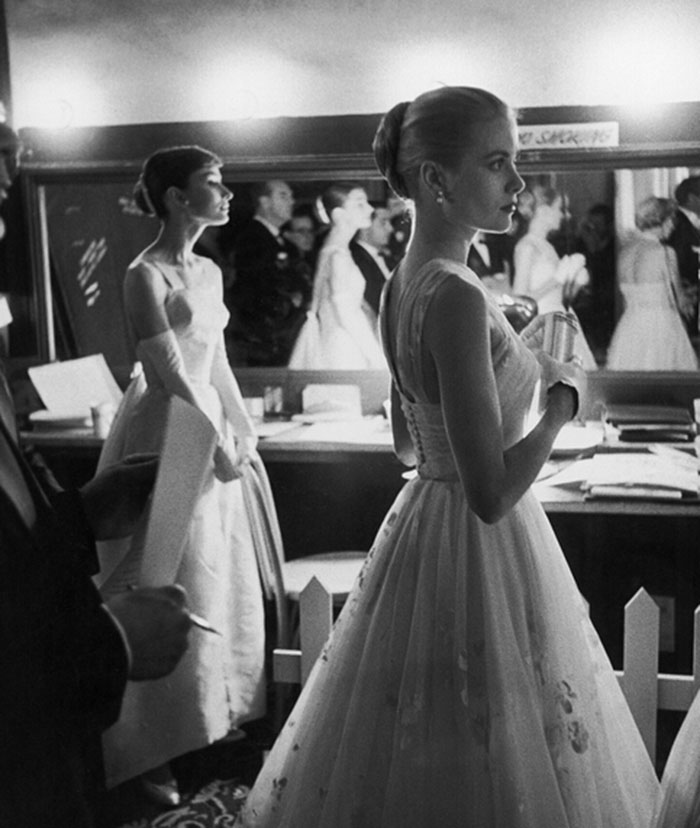 在1956年,奥黛丽·赫本作为颁奖嘉宾来到奥斯卡的现场,这张照片拍摄于后台,与她站在一起的格蕾丝·凯莉在这张照片拍摄完成的一个月之后,与雷尼尔三世在摩纳哥举行了婚礼。