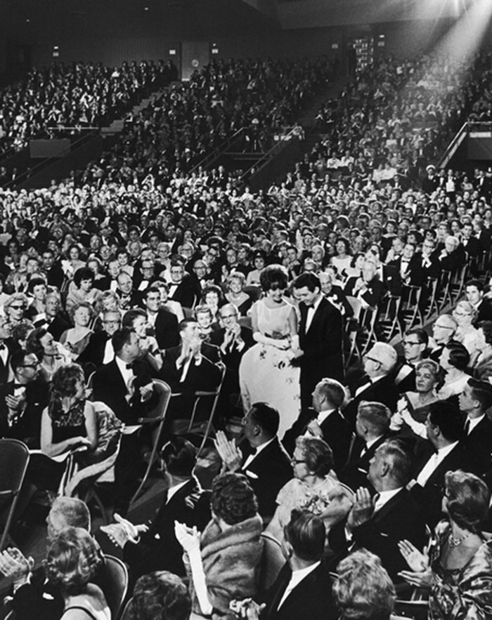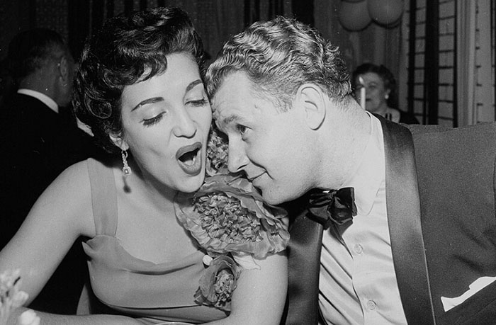 在马修选择的照片中,还有一张展示了罗德·斯泰格尔和凯蒂·茱拉黛之间的温情一刻。罗德与马龙·白兰度一同出演了电影《码头风云》,他凭借这部电影获得了最佳男配角的提名,不过遗憾的是,他最终同这一奖项擦肩而过。出生在墨西哥的凯蒂是首批来到好莱坞发展的拉丁美洲女演员之一,她凭借着在电影《断戈浴血记》的演出荣获了奥斯卡最佳女配角。她被拍到同斯泰格尔亲切交谈,而斯泰格尔也将耳朵靠近她,来倾听她的讲话内容。他们的面前还摆放着晚宴提供的牛排和薯条。