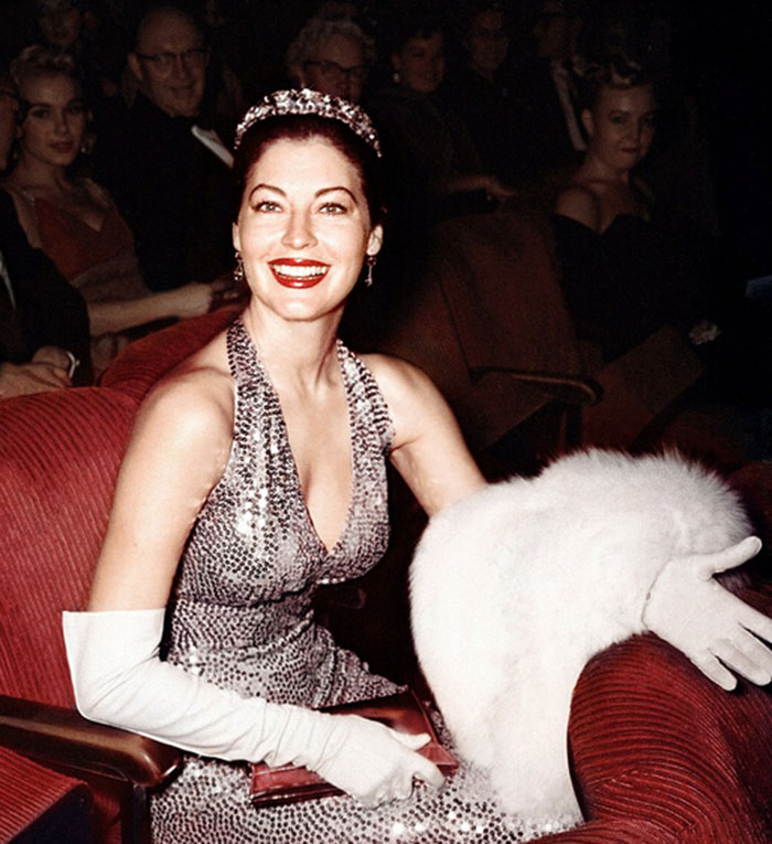 有着迷人银幕形象的艾娃·加德纳的身影也出现在了马修挑选的照片中,她曾与法兰克·辛纳屈,阿尔特·肖以及米基·鲁尼都有过婚姻的经历。在照片中她戴着头饰,身穿一件闪亮的裙子,手上戴着白色的手套,还拿了一条裘皮披肩。面对镜头,她也露出了灿烂的笑容。