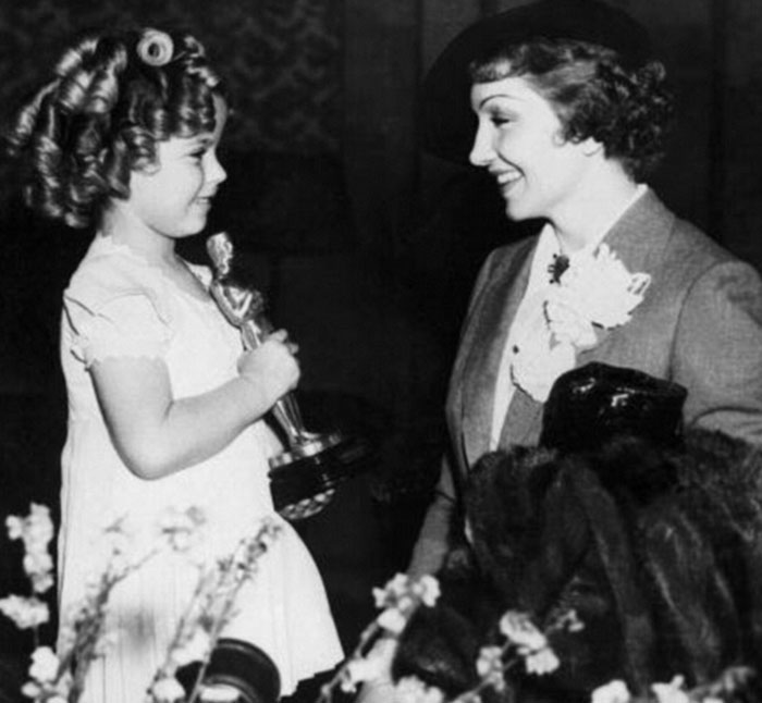 被挑选出的最暖心的一张照片是在1935年拍摄的,照片中的两人是女演员克劳德特·科尔伯特和秀兰·邓波儿。这位童星在那一年获得了奥斯卡青少年奖,她也收获了凭借电影《一夜风流》获得最佳女主角的克劳德特·科尔伯特对她的祝贺。她在1935年凭借电影《亮眼睛》获得了青少年奖,年仅六岁的她也成为了这一奖项历史上最年轻的获奖者,这让她一举成名。在献唱过歌曲《On The Good Ship Lollipop》之后,她的面容和声音更是成为了那一代人最深刻的记忆。她的卷发,天使般的脸庞,身穿格子花纹的连衣裙的形象,以及令人过目难忘的表演,都让她成为了那个时期最好的票房保证之一。