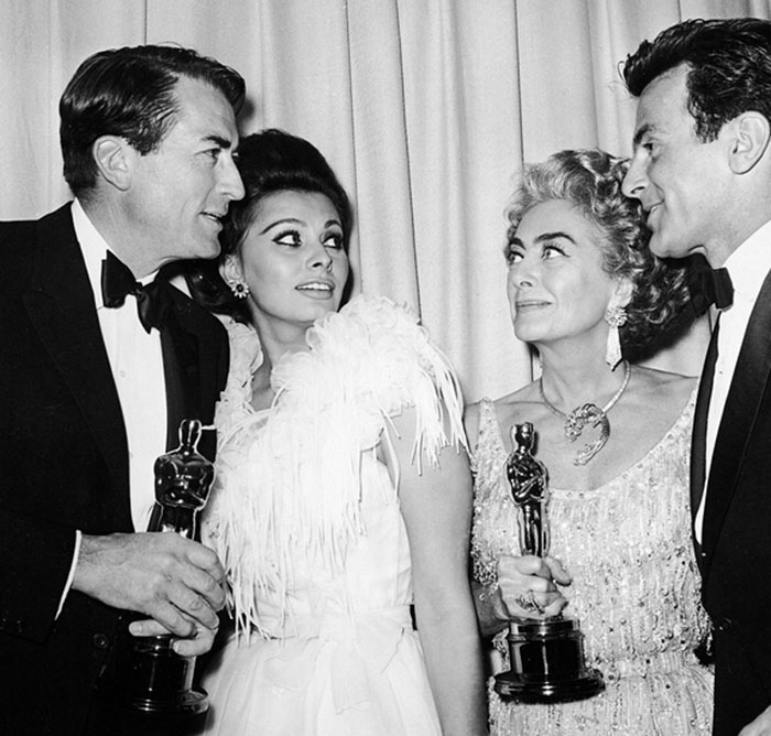马修另一张挚爱的照片是格里高利·派克,索菲娅·罗兰以及琼·克劳馥在后台站成一排的合影,在此之前,派克和克劳馥刚刚上台领奖。格里高利·派克在电影《杀死一只知更鸟》中扮演了芬奇律师,他凭借这一角色荣膺当年的最佳男演员,而琼·克劳馥则代替安妮·班克罗夫特上台领取了最佳女演员的奖杯。班克罗夫特凭借阿瑟·佩恩执导的影片《奇迹创造者》获得了这一荣誉。当时,班克罗夫特正在百老汇出演《Mother Courage and Her Children》,克劳馥在纽约为她代领了这一奖项。