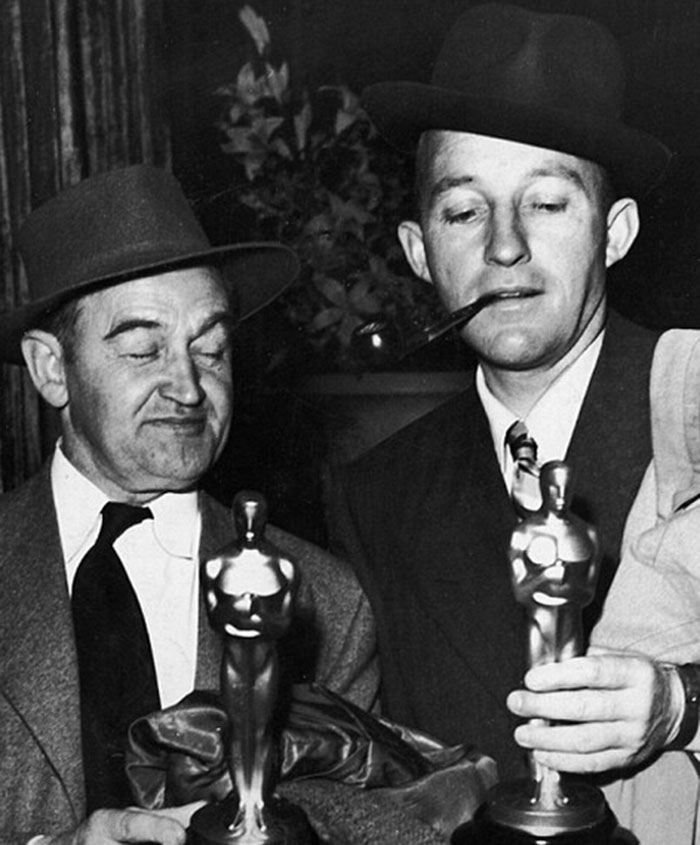 这张有趣的照片来自于1945年的奥斯卡颁奖典礼,出生在爱尔兰的演员巴里·菲茨杰拉德和平·克劳斯贝手里拿着各自的奖杯,看起来有一些不知所措。他们凭借在电影《与我同行》中的演出获得了奥斯卡的垂青。照片中,菲茨杰拉德正在抽烟,而克劳斯贝嘴里则叼着烟斗。